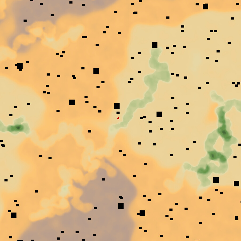 For the longest time, the game world was dominated by what I originally described as "mild hills". I must admit now that it was the most boring landscape one could possibly imagine. It finally started to change in February 2025, with the introduction of the "extreme hills". But as you can see in the elevation map taken before the work on the canyons began, those mountains were simple isolated peaks, added randomly around the map. They did not look natural at all and only looked interesting compared to the above-mentioned hills.